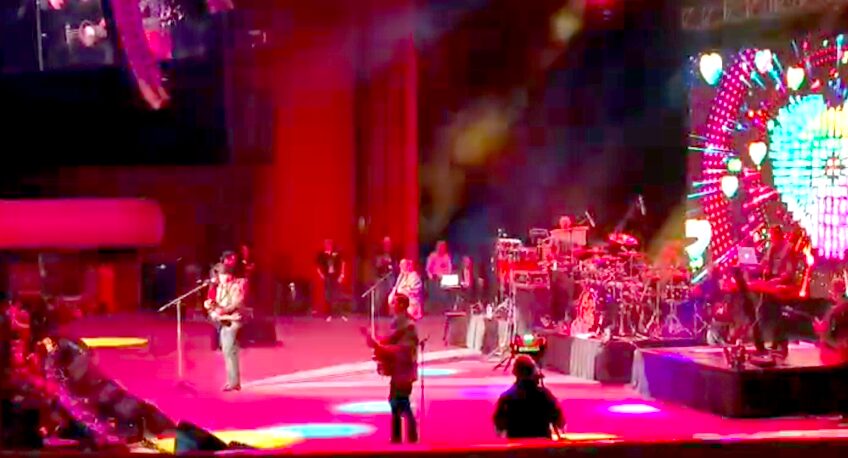 El recinto estaba lleno hasta el último asiento. La atmósfera, electrizada. Luces rosas acariciaban cada rincón del escenario, donde aguardaban en silencio los cómplices de la velada: un traje de lentejuelas negro y rojo para la banda, un acordeón expectante, guitarras que parecían contener la respiración, batería, piano y timbal listos para encender el corazón.