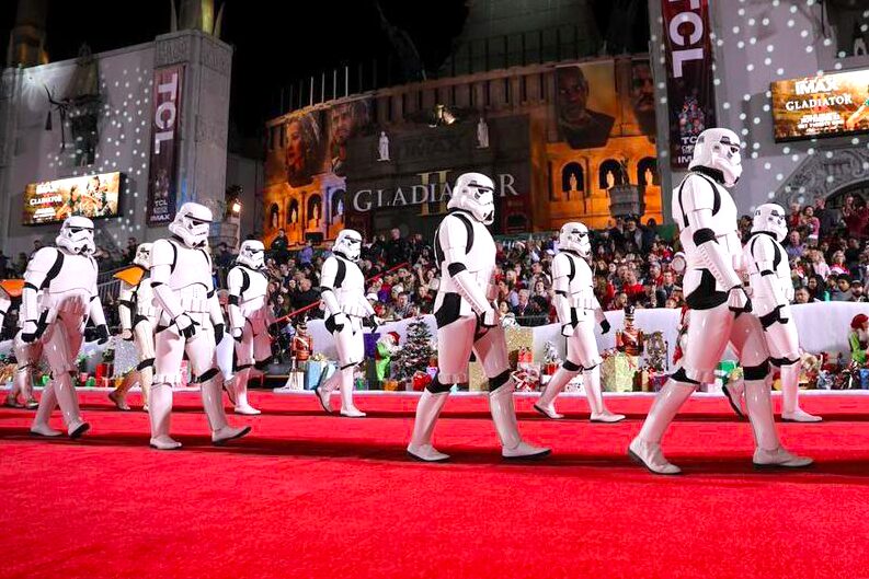 Imagen del 1 de diciembre de 2024 de participantes disfrazados de personajes de Star Wars durante la edición 92 del Desfile Anual Navideño de Hollywood en Los Ángeles, California, Estados Unidos. (Xinhua/Zeng Hui)