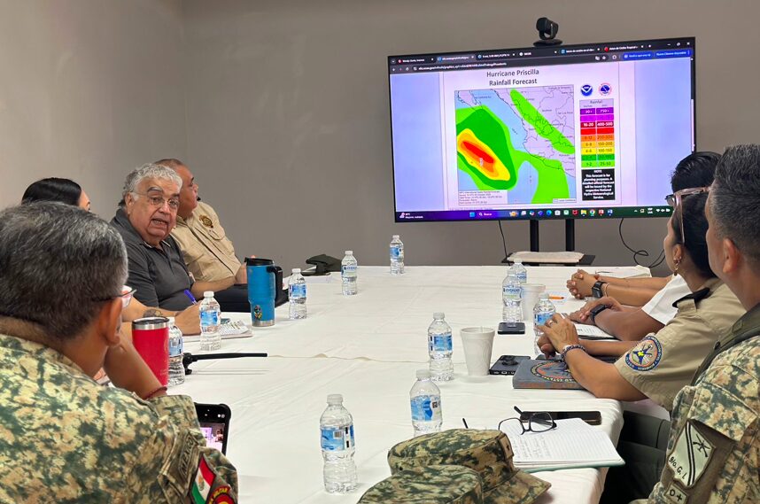 Por indicaciones del presidente municipal, Luis Munguía González, el director de Protección Civil y Bomberos de Puerto Vallarta, Misael López Muro, encabezó una mesa de trabajo preventiva con el propósito de dar seguimiento a la trayectoria del huracán Priscilla y coordinar acciones interinstitucionales para salvaguardar a la población.