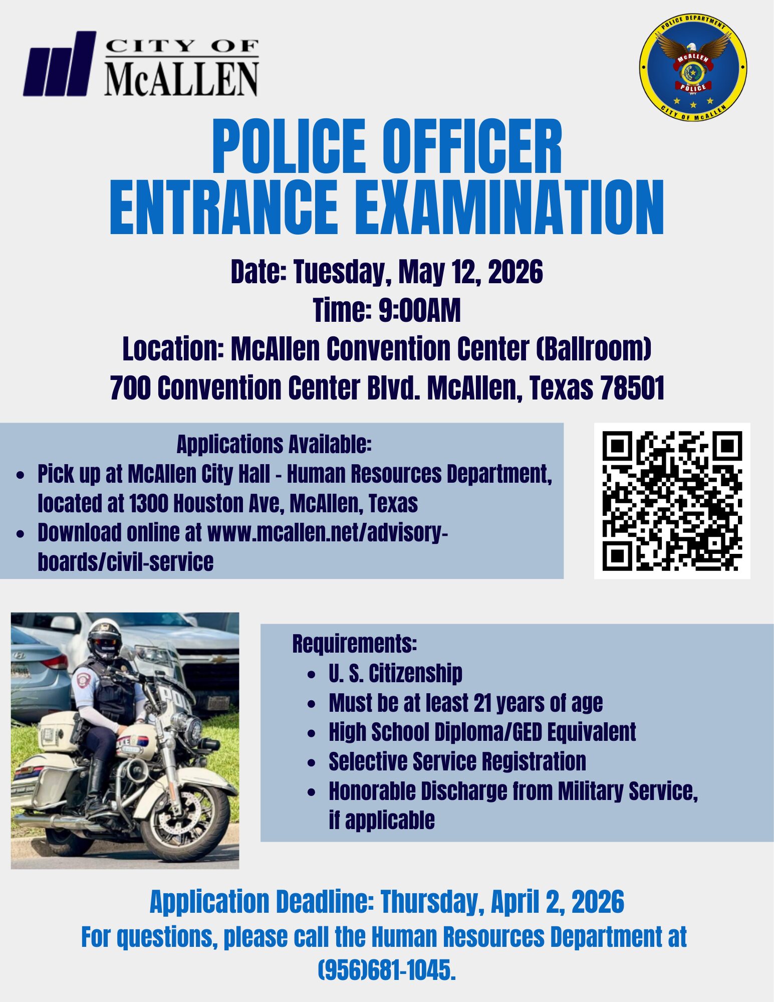 The City of McAllen will be administering a Civil Service Examination for Entry Level Police Officer on Tuesday, May 12, 2026. Pursuant to Chapter 143.024 of the Government Code, the following notice is being posted. The examination will be based on the person’s general knowledge and aptitude and will inquire into the applicant’s general education and mental ability.