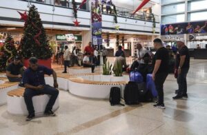 Personas esperan en una sala del Aeropuerto Internacional Simón Bolívar, en Maiquetía, estado de La Guaira, Venezuela, el 25 de noviembre de 2025. (Xinhua/Marcos Salgado)