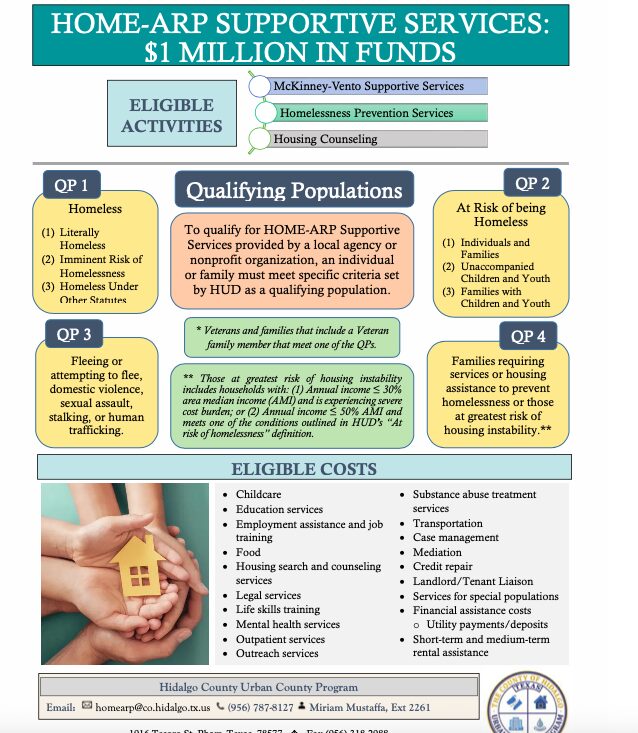 For more information about the HOME-ARP Supportive Services NOFA, eligible activities, or application requirements, visit our website or contact the Hidalgo County Urban County Program at (956) 787-8127 or email homearp@co.hidalgo.tx.us.