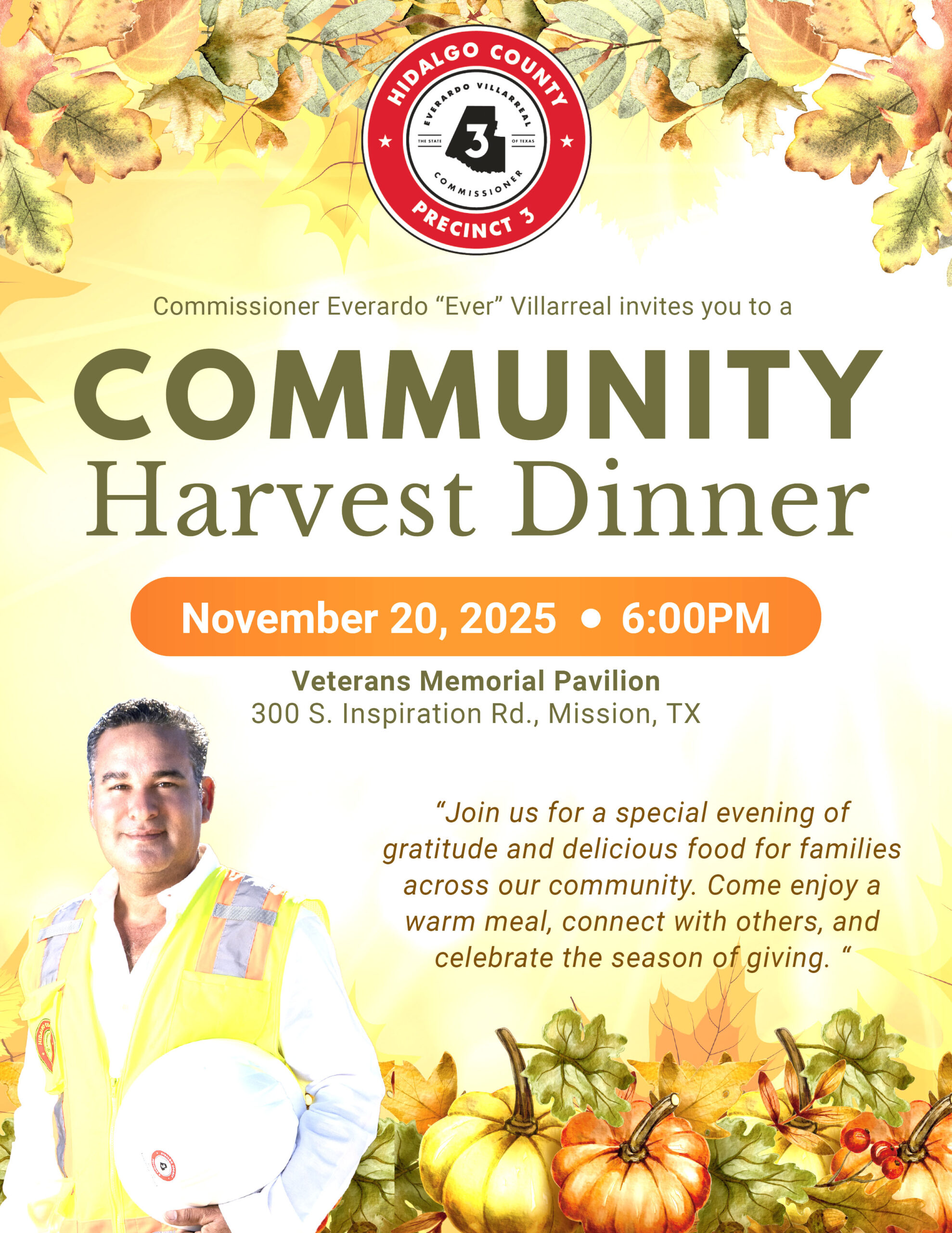 MISSION, TX – Precinct 3 Commissioner Everardo “Ever” Villarreal and the Community Outreach Division are proud to announce the upcoming Community Harvest Dinner, a heartfelt initiative designed to bring families, neighbors, and community leaders together in celebration of gratitude, connection, and service.
