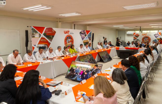 Durante la sesión, desarrollada en la Facultad de Medicina Veterinaria y Zootecnia, el rector destacó que el rumbo de la UAT se construye con orden, visión y responsabilidad compartida, luego de dar seguimiento a la agenda de trabajo de este cuerpo colegiado que integran las directoras y directores de las 27 facultades, unidades académicas y escuelas preparatorias de esta casa de estudios.