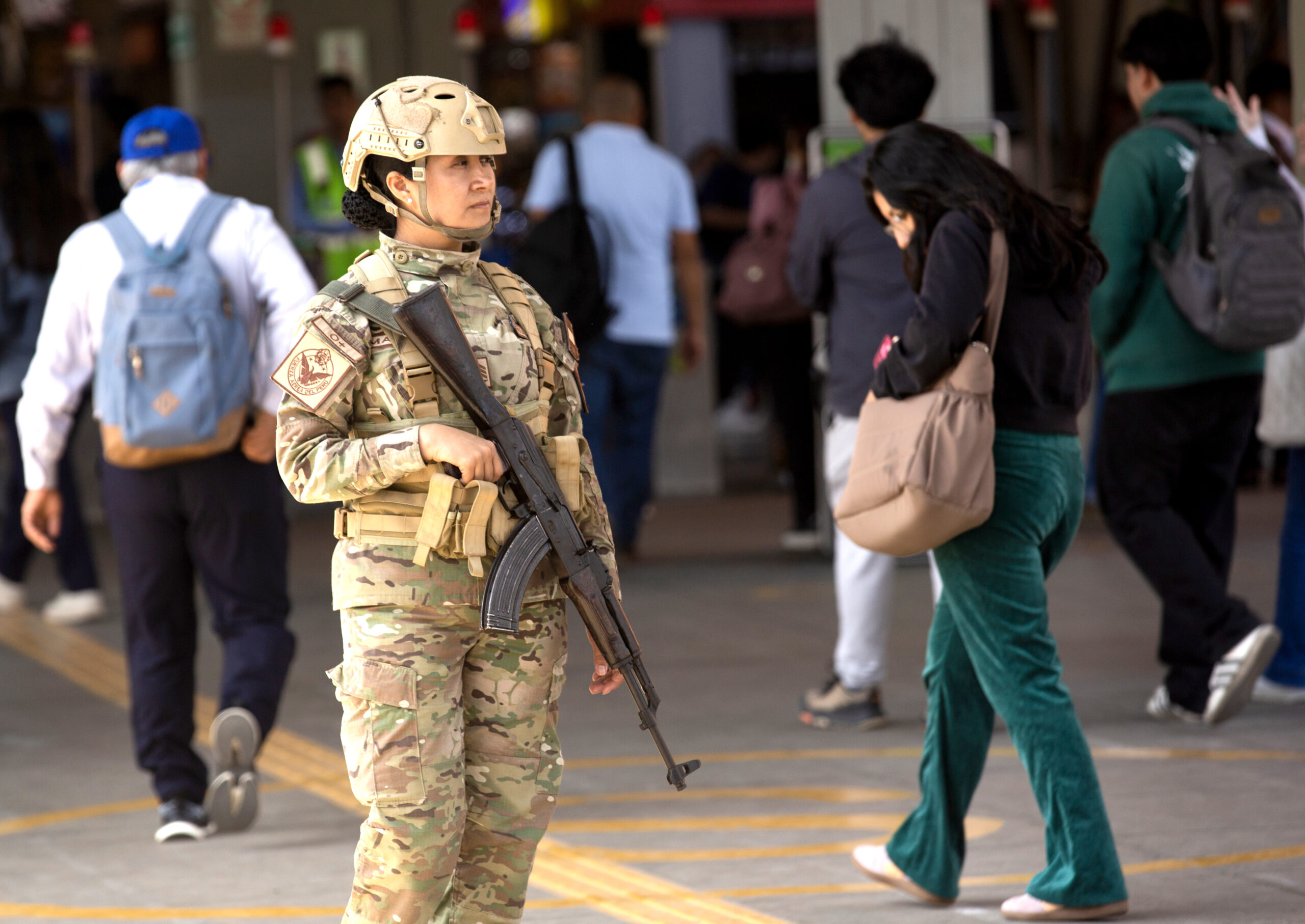 LIMA, (Xinhua) — Una integrante de la Fuerza Aérea del Perú monta guardia en la estación La Cultura del Metro de Lima, en Lima, Perú, el 22 de octubre de 2025. El presidente de Perú, José Jerí, anunció el martes la declaratoria de emergencia en Lima Metropolitana y su vecina provincia del Callao, por un periodo de 30 días calendario, con el objetivo de enfrentar los altos índices de criminalidad e inseguridad que afronta la nación sudamericana. (Xinhua/Mariana Bazo)