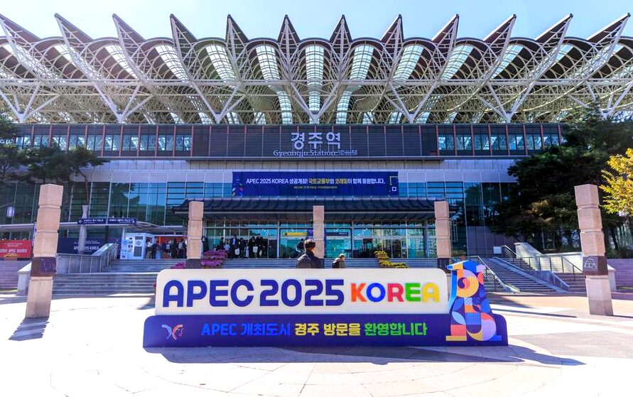 La foto tomada el 28 de octubre de 2025 muestra una instalación de publicidad de la 32ª Reunión de Líderes Económicos del Foro de Cooperación Económica Asia-Pacífico (APEC, por sus siglas en inglés) en Gyeongju, en la República de Corea. (Xihua/Park Jintaek)