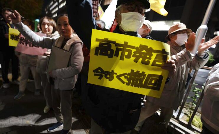 (Xinhua) — Imagen del 25 de noviembre de 2025 de personas asistiendo a una protesta frente a la residencia oficial de la primera ministra japonesa, en Tokio, Japón. Bajo el frío que siguió a una lluvia temprana de invierno, grupos de manifestantes se congregaron nuevamente frente a la residencia oficial de la primera ministra japonesa el martes por la noche en Tokio, atraídos por la creciente preocupación por las recientes declaraciones de la primera ministra japonesa, Sanae Takaichi, sobre Taiwan. (Xinhua/Jia Haocheng) (jg) (da) (vf)