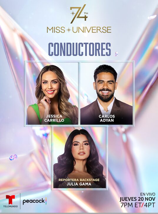- A las 8pm ET/7CT/5PT, comienza la esperada transmisión en vivo de costa a costa de la 74ª edición de Miss Universe® conducida por Jacqueline Bracamontes, Danilo Carrera, Carlos Adyan y Jessica Carrillo. El evento de este año presentará a las 120 mujeres de todo el mundo que competirán por la codiciada corona en un espectáculo deslumbrante lleno de música, brillo y emoción. Julia Gama estará como reportera backstage trayendo todo lo que ocurre tras el escenario, mientras Victoria Kjær Theilvig se prepara para entregar su corona a la nueva reina universal. Este año, la copresentadora de La Mesa Caliente y ganadora de Miss Universe® 2020, Andrea Meza, será miembro del Comité de Selección junto a otras reconocidas personalidades.